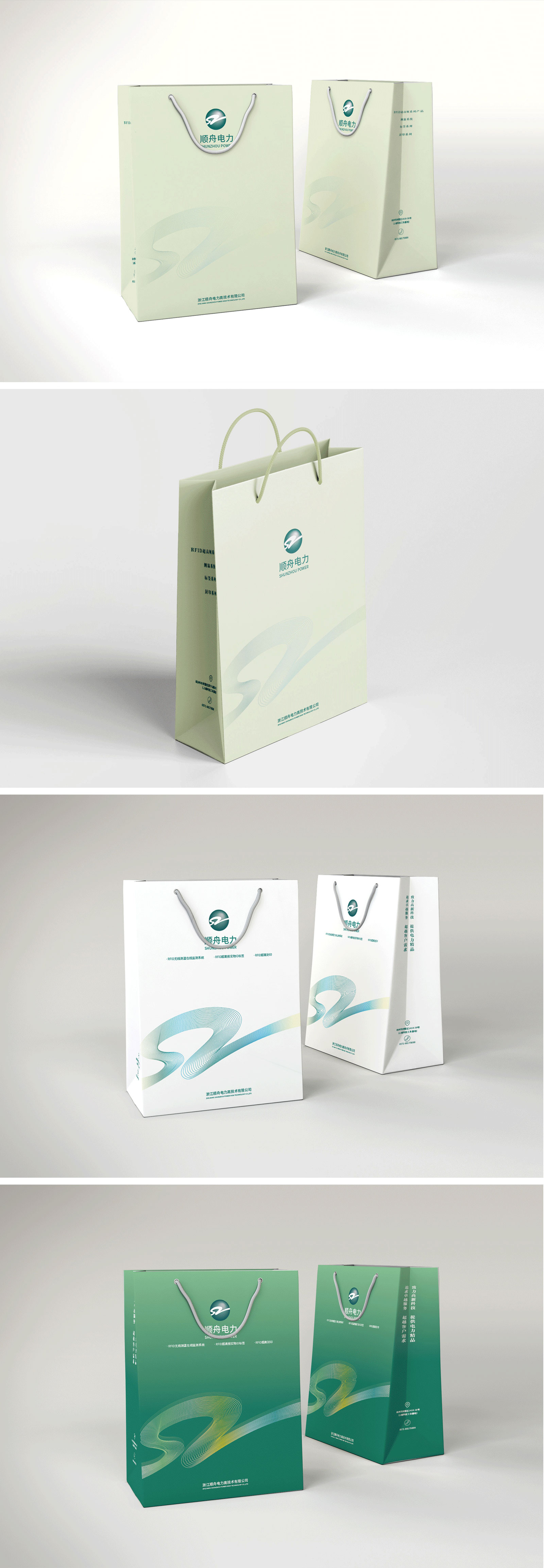 手提袋具有流動性強(qiáng)、宣傳性強(qiáng)等優(yōu)點(diǎn),對企業(yè)品牌形象的宣傳有一定的促進(jìn)作用。基于此,石特對此次的設(shè)計任務(wù)提出了新的想法:手提袋在設(shè)計時,其主畫面以公司的logo與企業(yè)名稱為主,logo以漸變色的線條構(gòu)成,畫面干凈簡潔,在加深受眾對公司印象的同時也有利于獲得更好的宣傳效果;在色彩選擇上,選取淡綠色為主色調(diào),與企業(yè)的標(biāo)準(zhǔn)色保持一致,宣傳更具統(tǒng)一性。此外,石特還對順舟電力產(chǎn)品折頁進(jìn)行了設(shè)計,獲得了客戶的認(rèn)可。