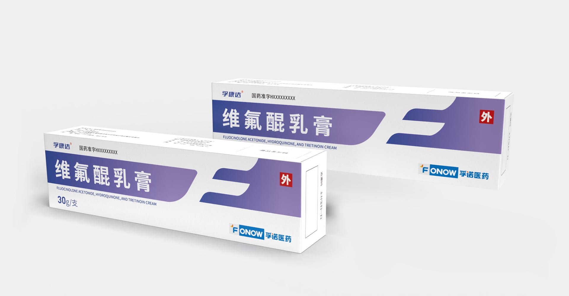 孚諾醫藥兩批次委托石特大健康進行產品包裝設計,首次設計產品上市滿意后進行了二次新款的設計;為維氟醌乳膏設計包裝:“孚康達”的首字母“F”進行創意設計,紫色、白色色塊勾勒“F”字形,增強品牌識別,紫色寓意優雅、高貴,以其為主色與產品主要治療功效變美的預期目標相符合。同款產品兩個渠道不同設計方案。