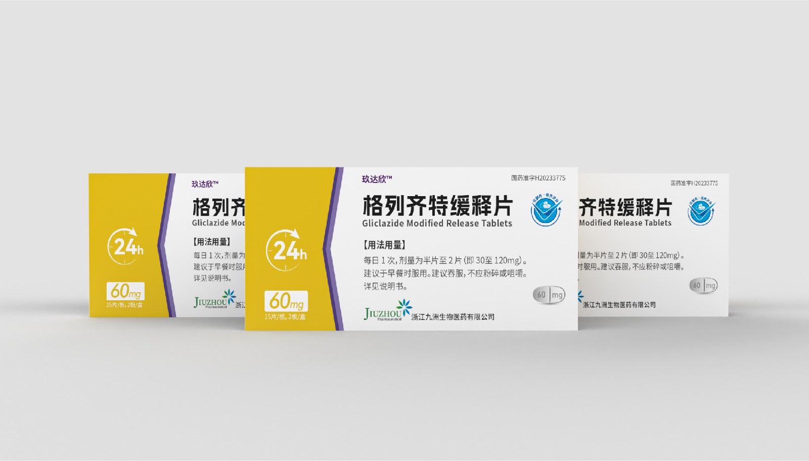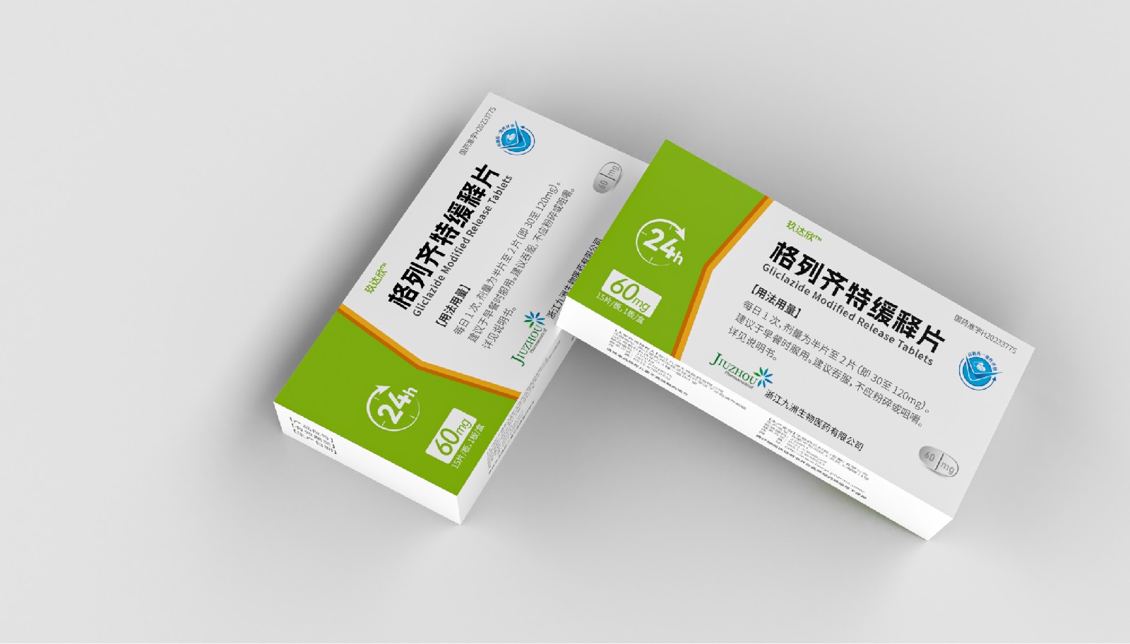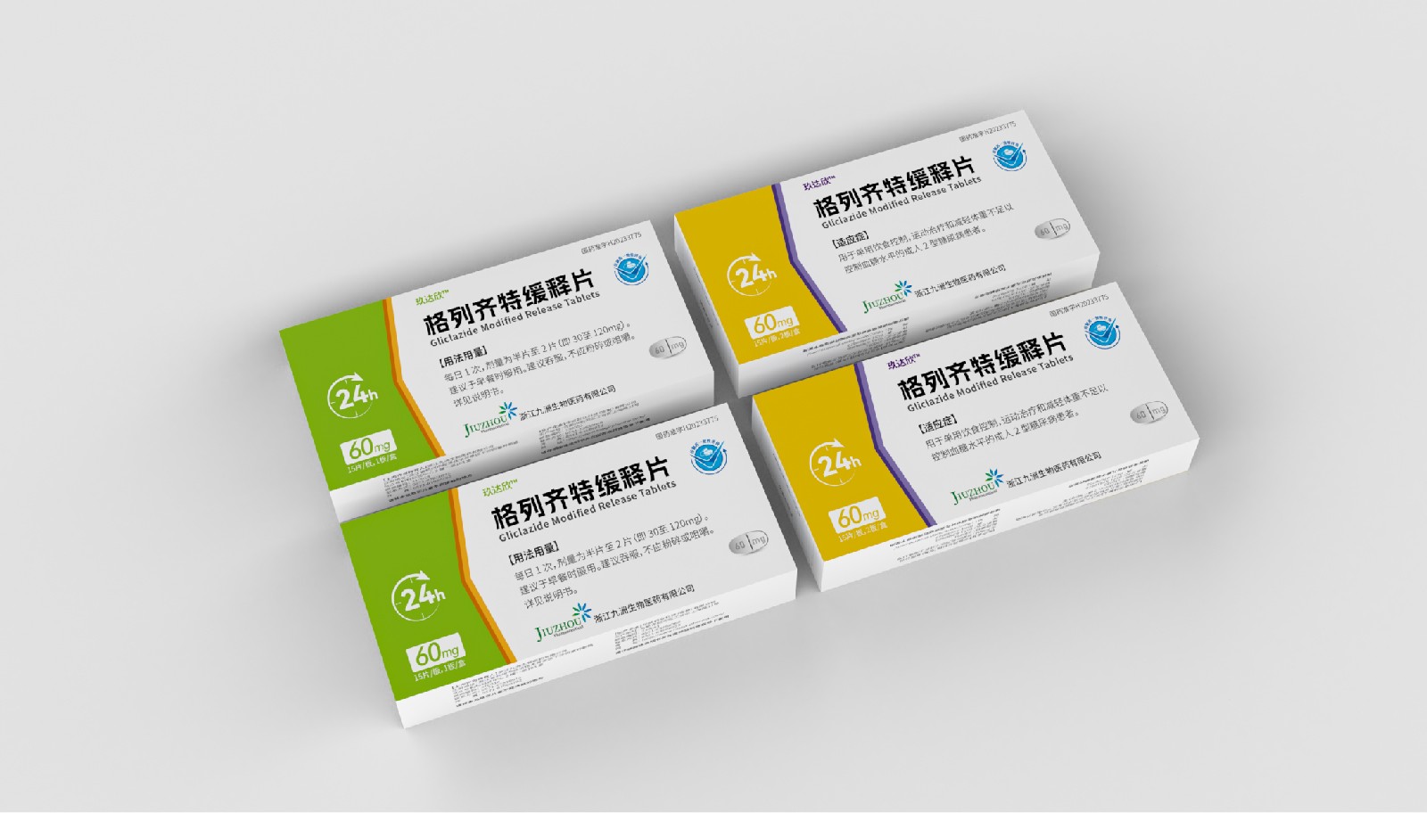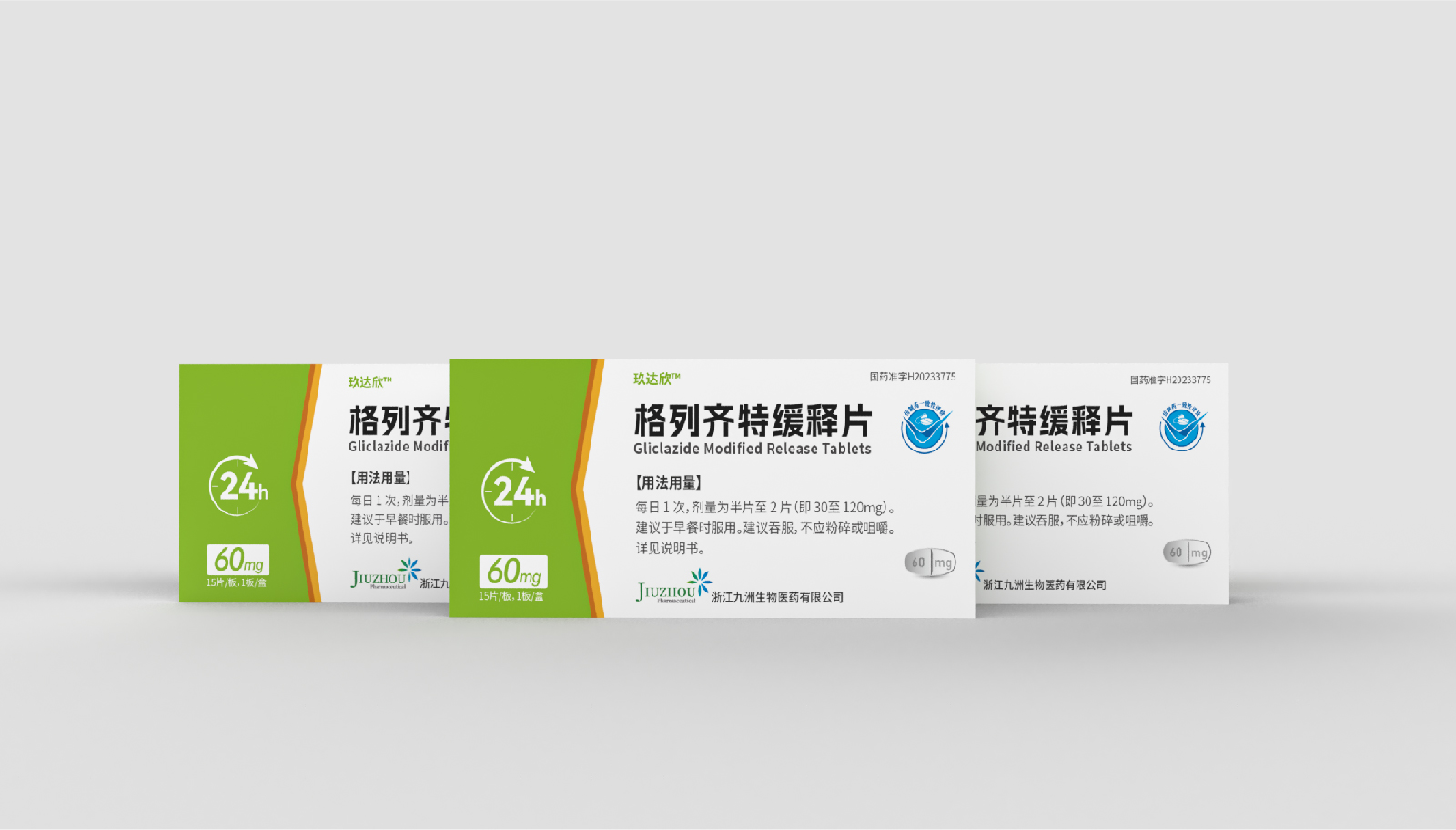 設(shè)計(jì)方案中藥效持續(xù)時(shí)間作為視覺符號(hào)出現(xiàn),起到強(qiáng)調(diào)藥突出作用。強(qiáng)調(diào)用法用量與藥效持續(xù)時(shí)間數(shù)字“1”、“24”做傾斜處理體現(xiàn)速度感,在起到突出強(qiáng)調(diào)的同時(shí),也體現(xiàn)藥片控制血糖速度之感。企業(yè)標(biāo)志和企業(yè)名稱結(jié)合使用突出企業(yè)形象。藥片設(shè)計(jì)突出單片藥劑量和藥片可掰片使用。