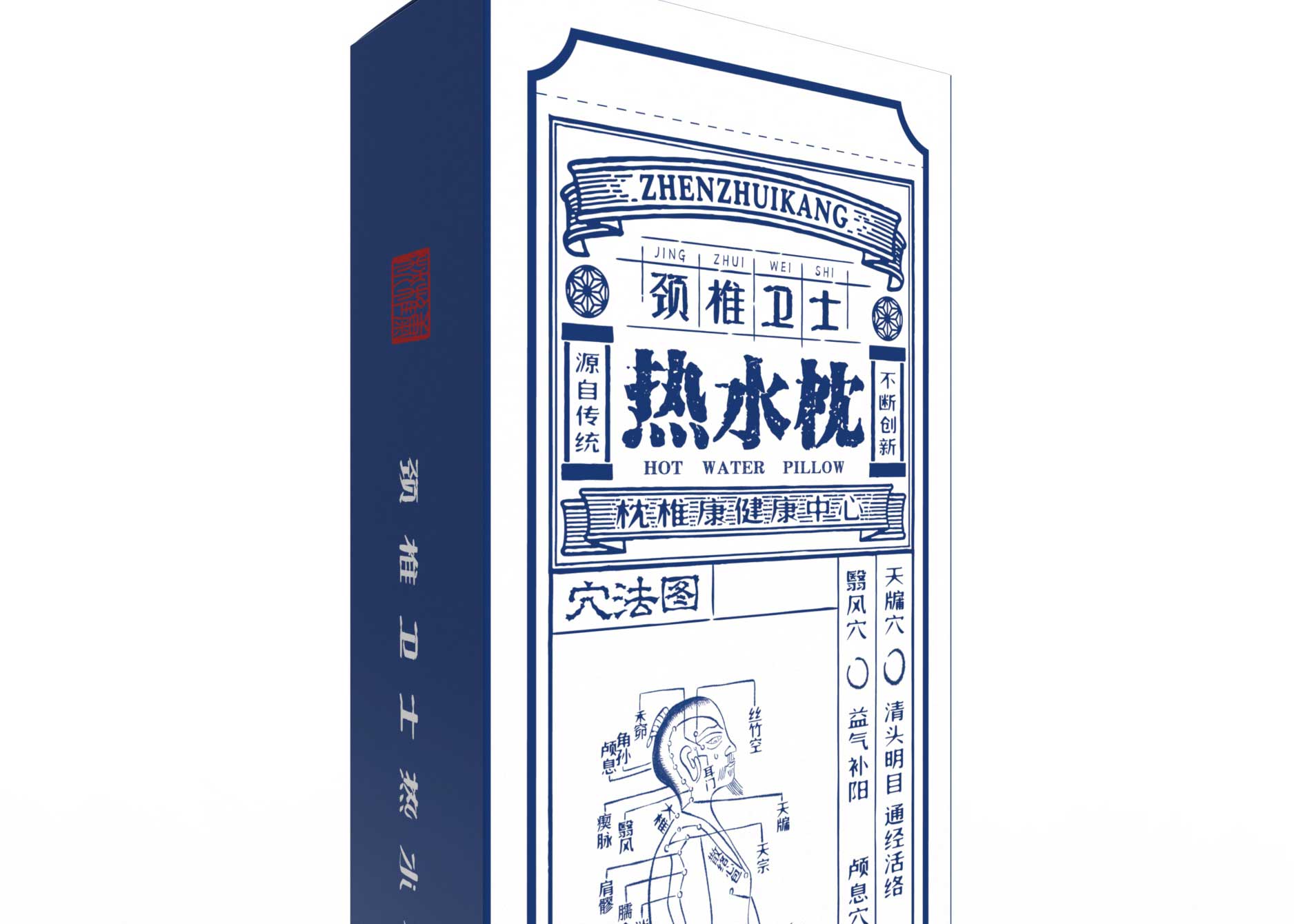 包裝上繪有人體穴法圖,將傳統的中醫療法淋漓盡致的表達出來,同時繪有使用方法示意圖,這樣購買者使用比較方便。除了使用說明及警告這些常規文字產品包裝上還放有頸椎小貼士讓購買者感覺既貼心又實用。產品包裝主題顏色是藍色,向購買者傳達一種健康的理念。